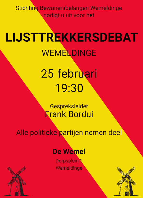 Op 18 maart zijn er weer gemeenteraadsverkiezingen. Om onze Wemeldingse inwoners te informeren over wat de politiek de komende jaren voor hun in petto heeft organiseren we, als Stichting Bewonersbelangen Wemeldinge, weer een lijsttrekkersdebat.